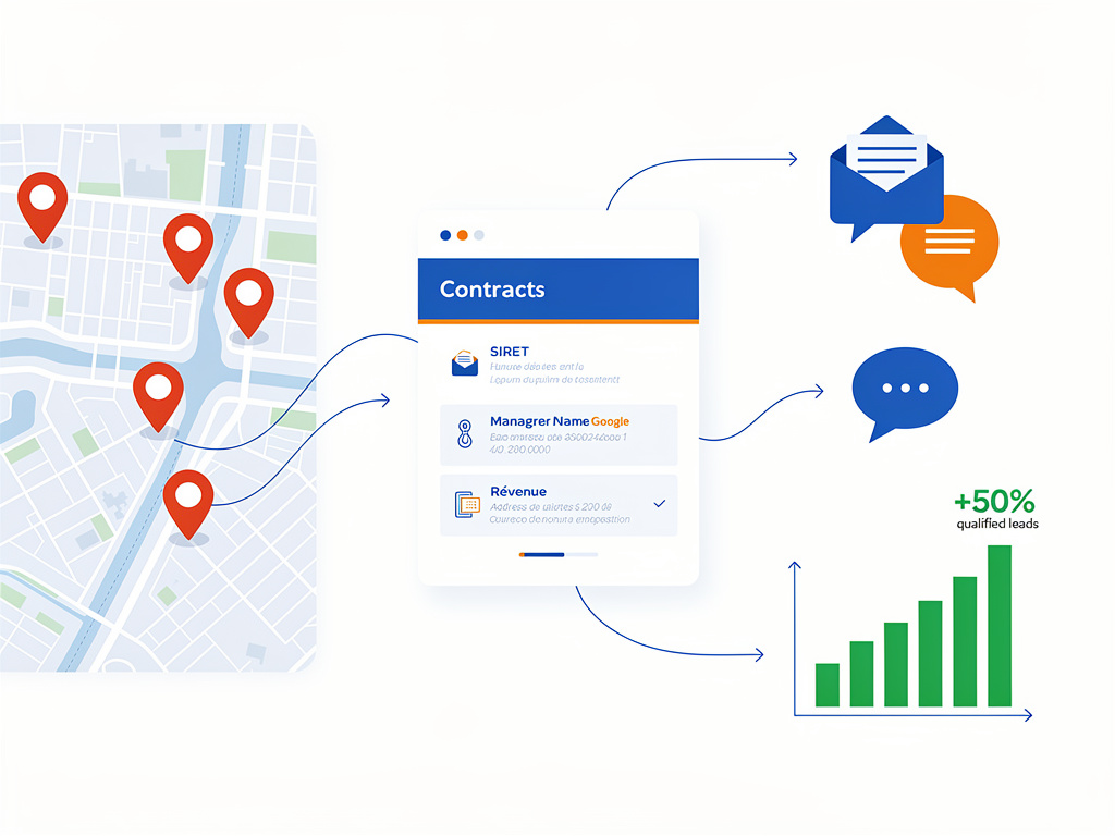 Récupération automatique d'entreprises via Google + annuaires pros. Complétion SIRET/adresse/dirigeant/CA, ajout en CRM, envoi email/SMS vers landing page.